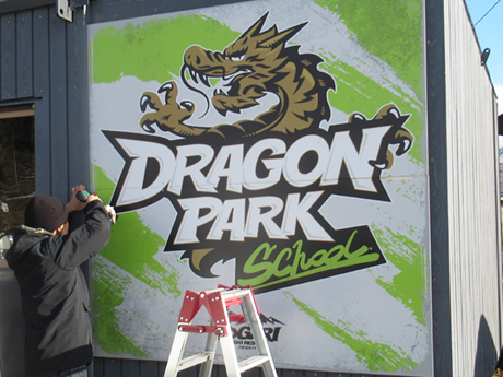 | テント屋根部分に文字入れ | 食品製造工場の壁に文字描き込み | バナー製作 |